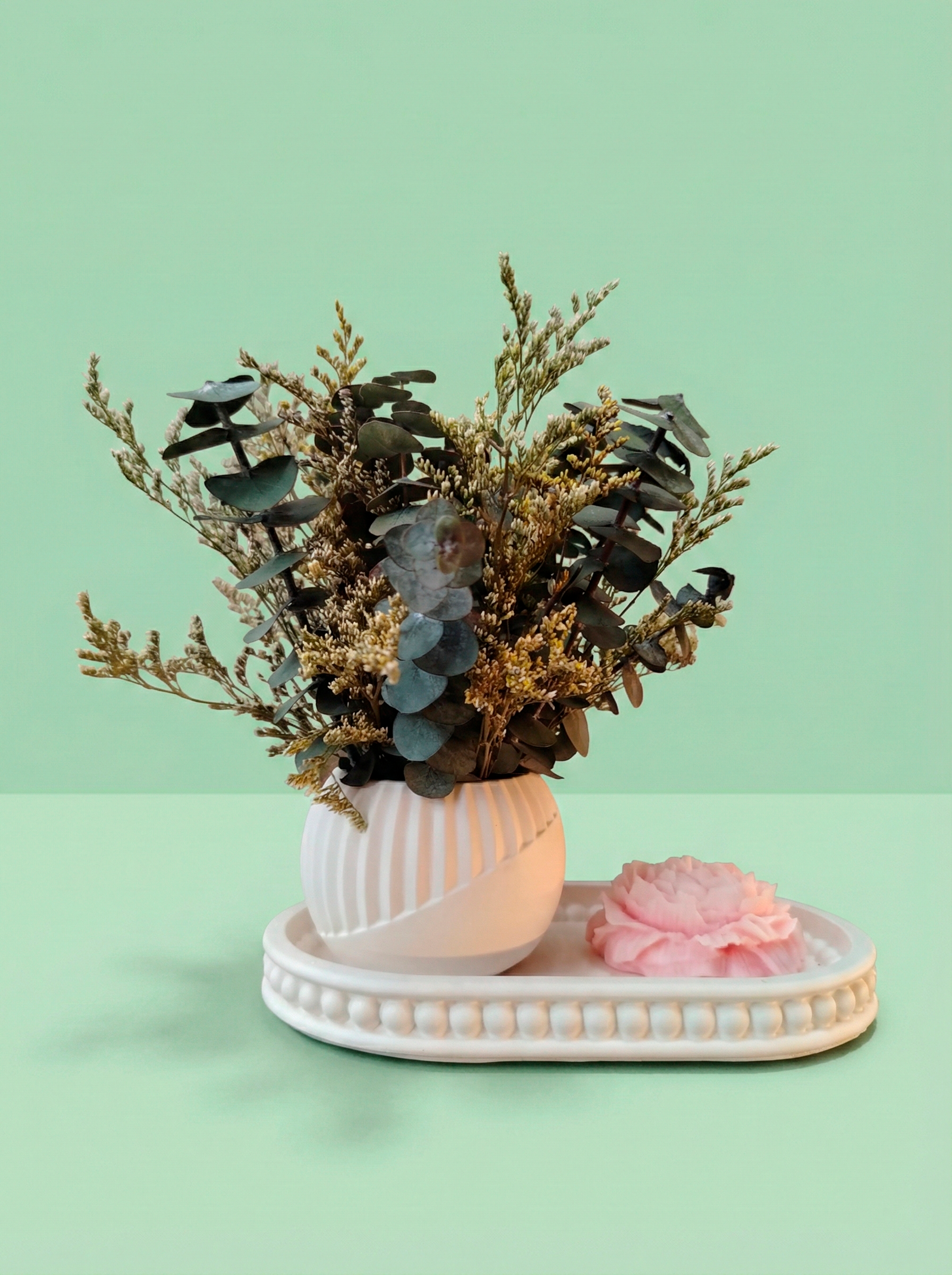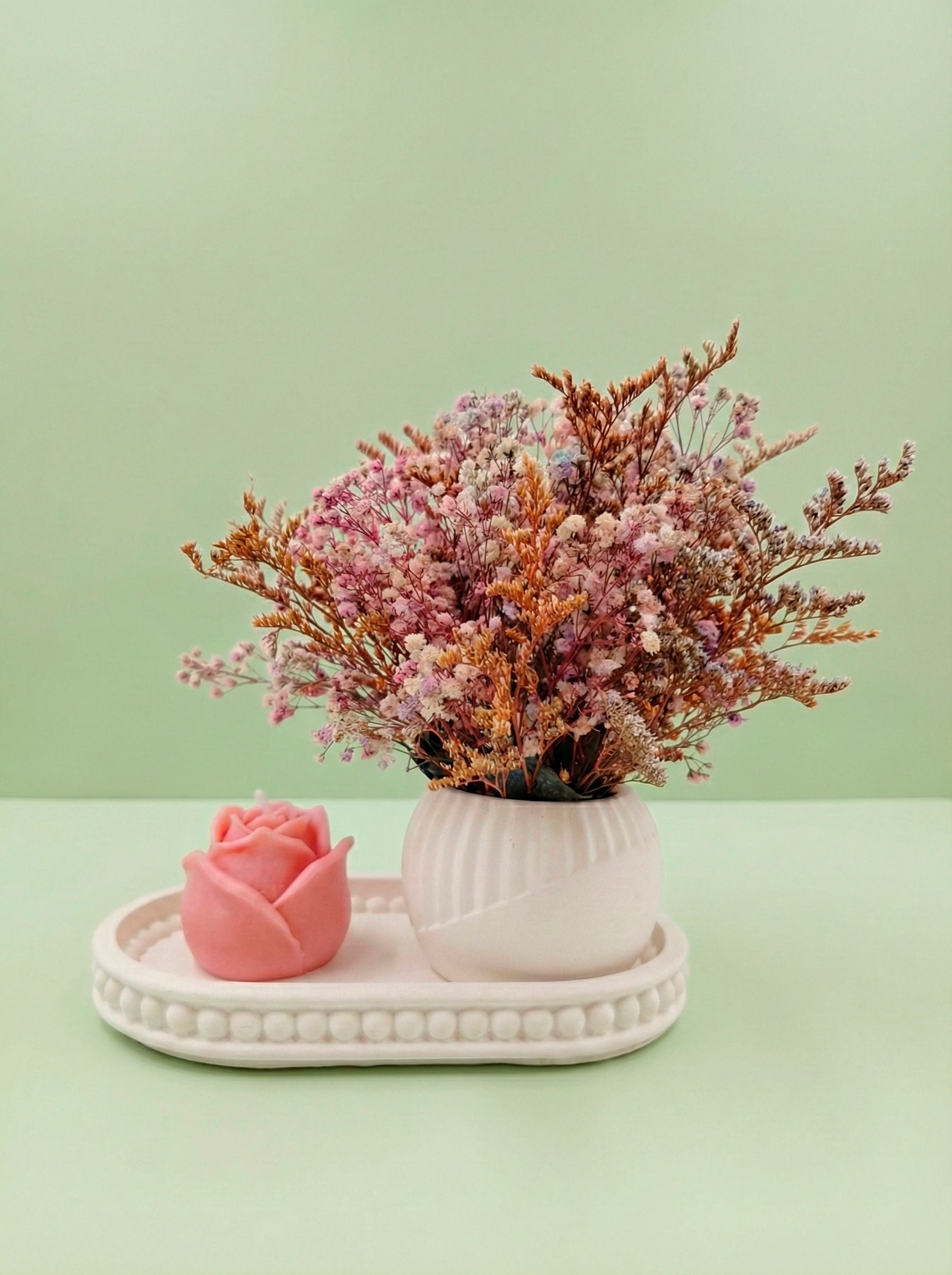 Esta bandeja decorativa ha sido diseñada como un gesto de amor cuidado y equilibrado, donde cada elemento cumple un propósito estético y emocional. El conjunto integra un mini arreglo floral con flores preservadas de larga duración, dispuesto en una base esférica artesanal, acompañado de una vela decorativa en forma de peonía, creando una composición delicada y acogedora.