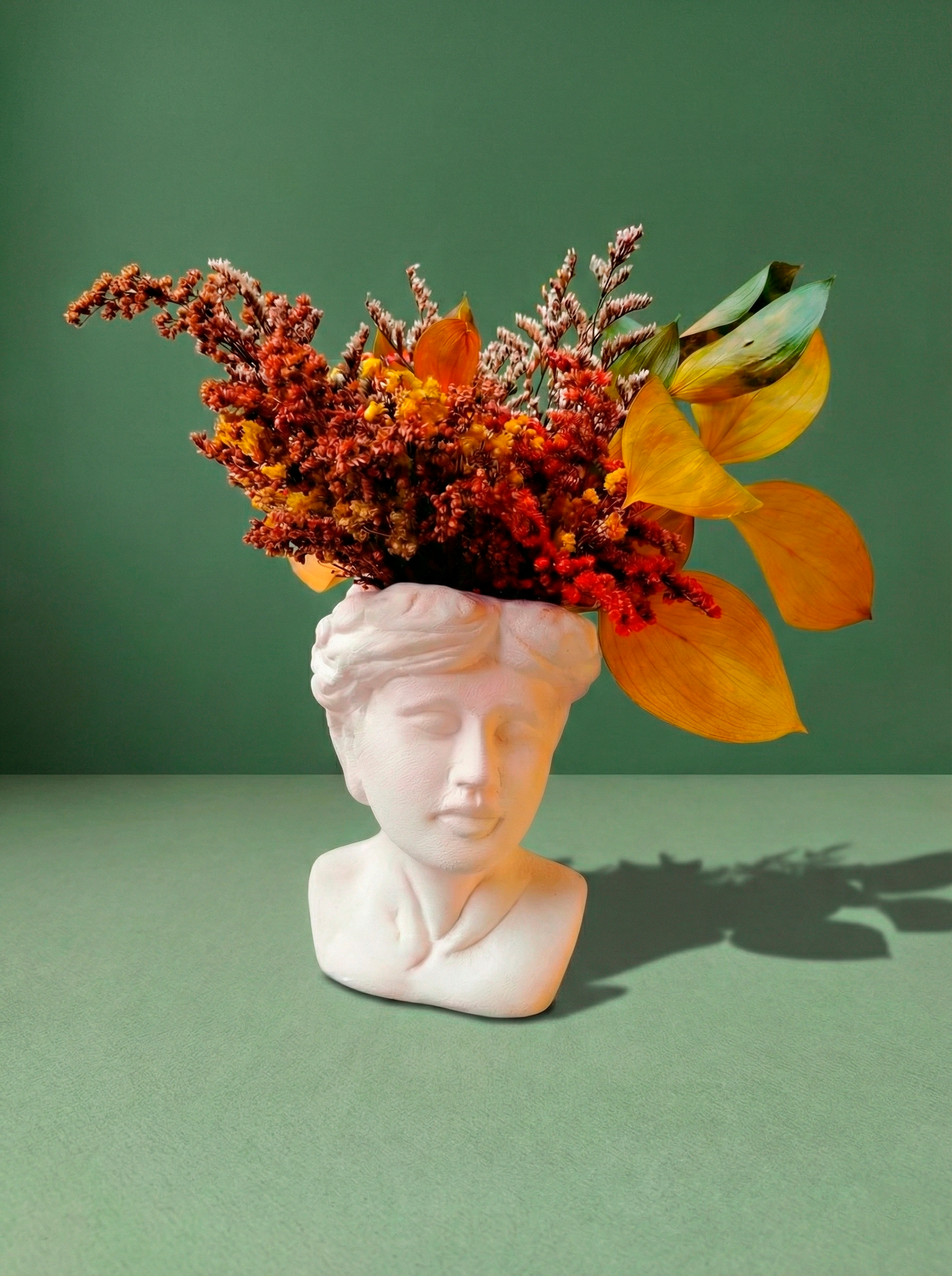 Este diseño floral escultórico es una interpretación contemporánea del arte clásico, donde la forma, la textura y el color dialogan en perfecta armonía. Su base escultórica de líneas suaves, inspirada en la estética atemporal de la escultura, se convierte en el soporte ideal para un diseño floral preservado cuidadosamente trabajado a mano.