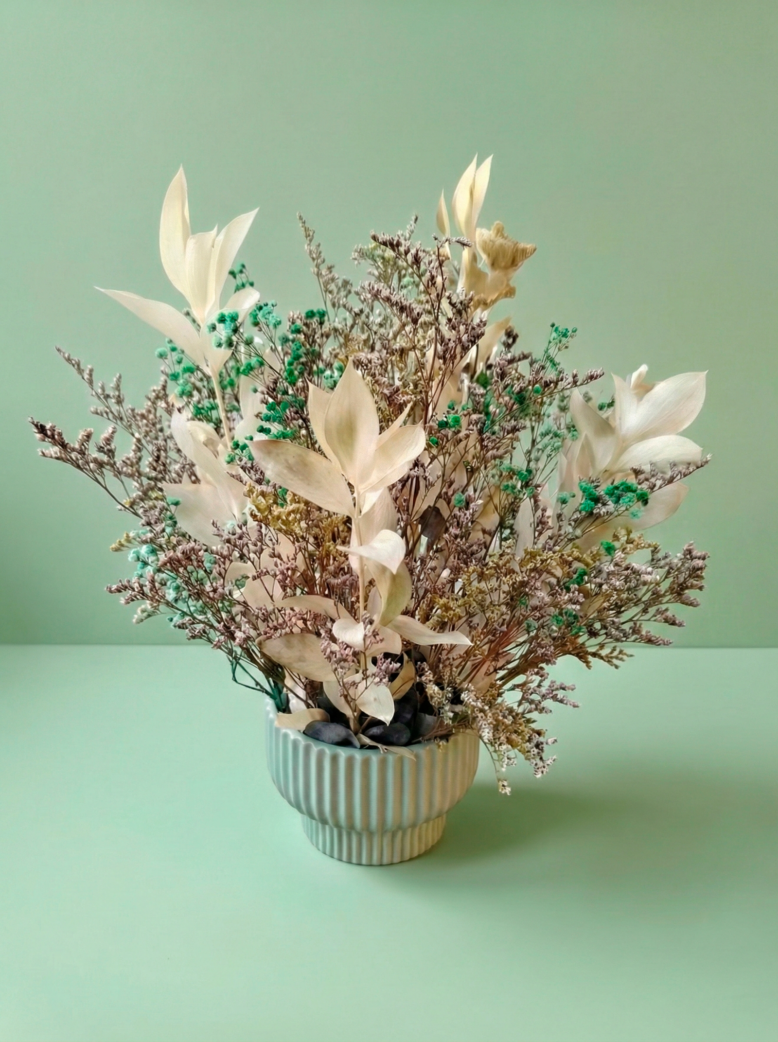 Este florero escultura es una pieza que transforma el espacio desde la calma y la armonía. Su base de cerámica acanalada, de diseño limpio y contemporáneo, sostiene una composición floral preservada de alto volumen, creada para aportar ligereza visual, textura y sofisticación sin exceso.